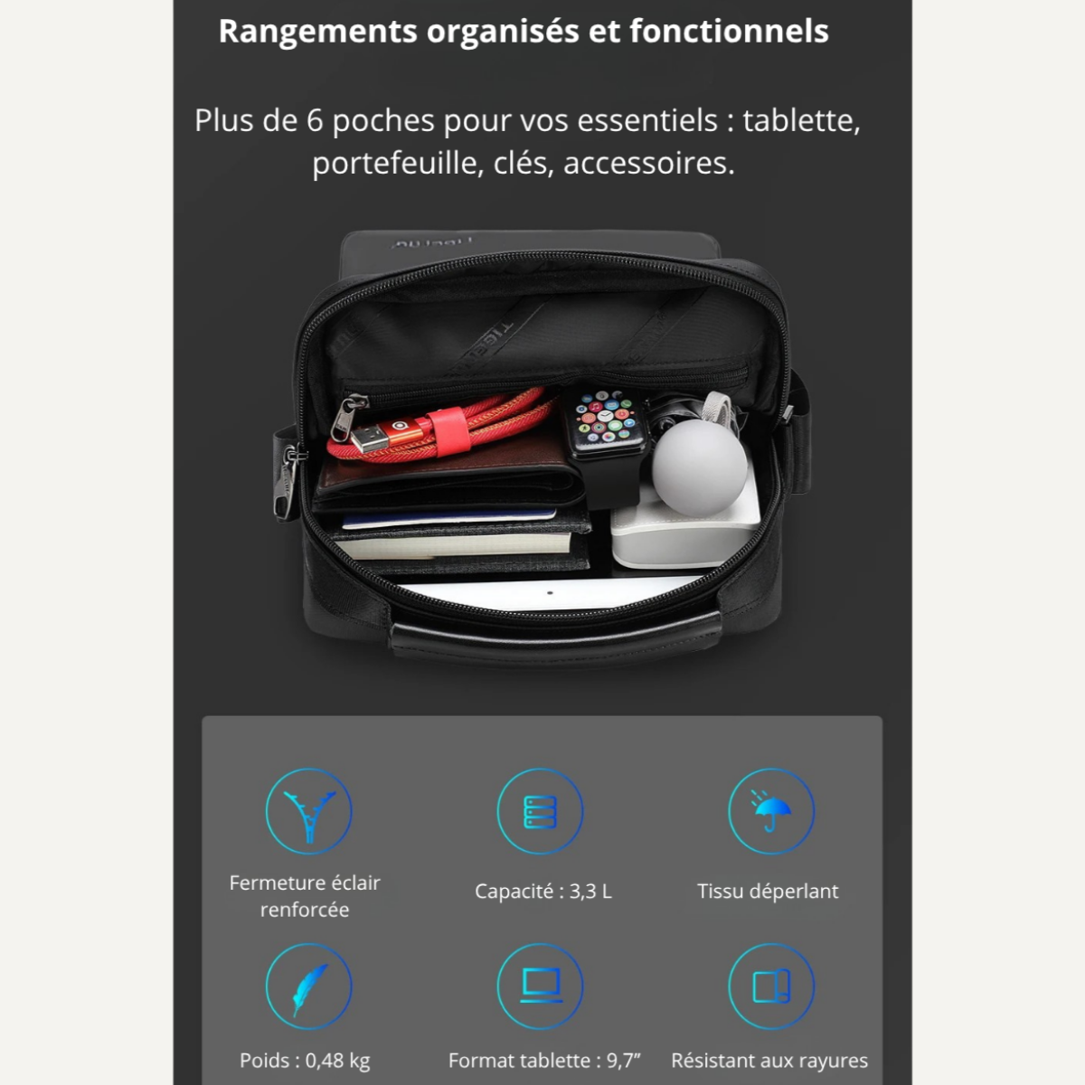 Capacité optimisée : volume de 3,3 L, avec un compartiment principal rembourré pour tablette, et plusieurs poches intérieures bien pensées.