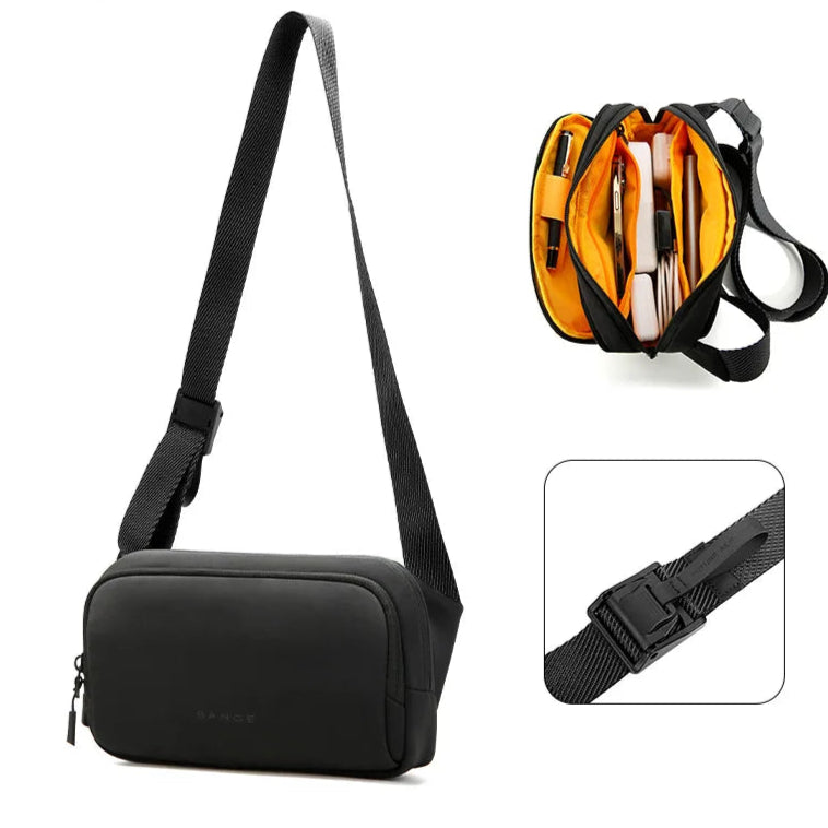 La sacoche banane Mauro a été conçue pour les hommes qui aiment voyager léger tout en restant parfaitement organisés. Grâce à ses compartiments intelligents et son design compact, elle est idéale pour ranger smartphone, clés, câbles, portefeuille ou accessoires de voyage en toute sécurité, sans compromettre le confort de port.