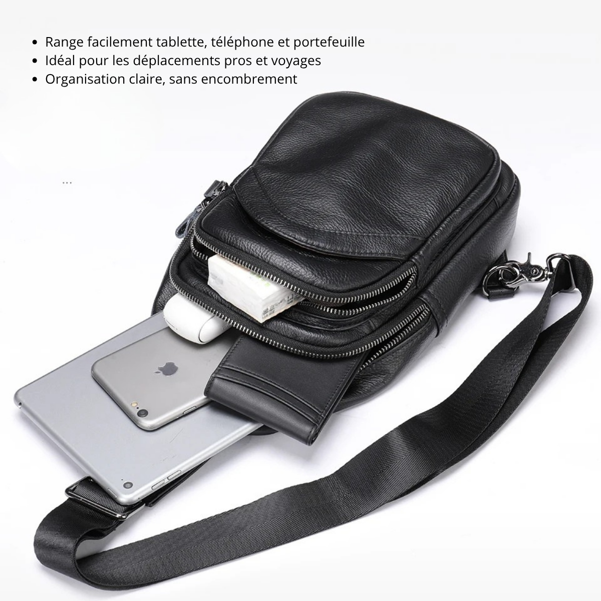 Elle te permet de garder l’essentiel à portée de main — téléphone, portefeuille, clés, lunettes, carnet, écouteurs — sans t’encombrer d’un grand sac.
