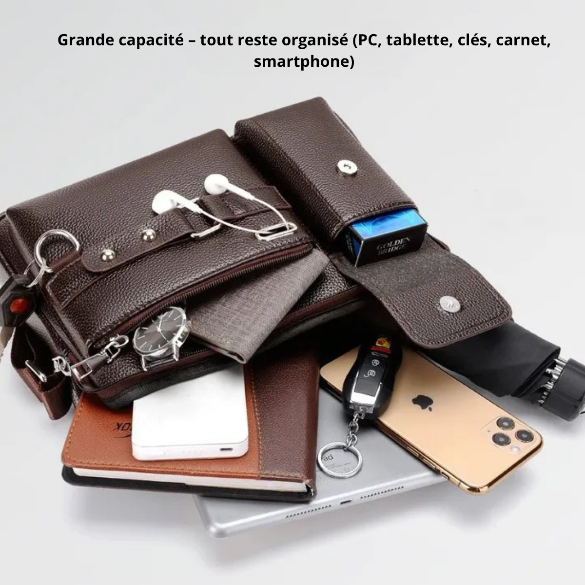 Oui. Espace prévu pour smartphone grand format, portefeuille, clés, écouteurs et papiers. Plusieurs poches évitent le bazar.