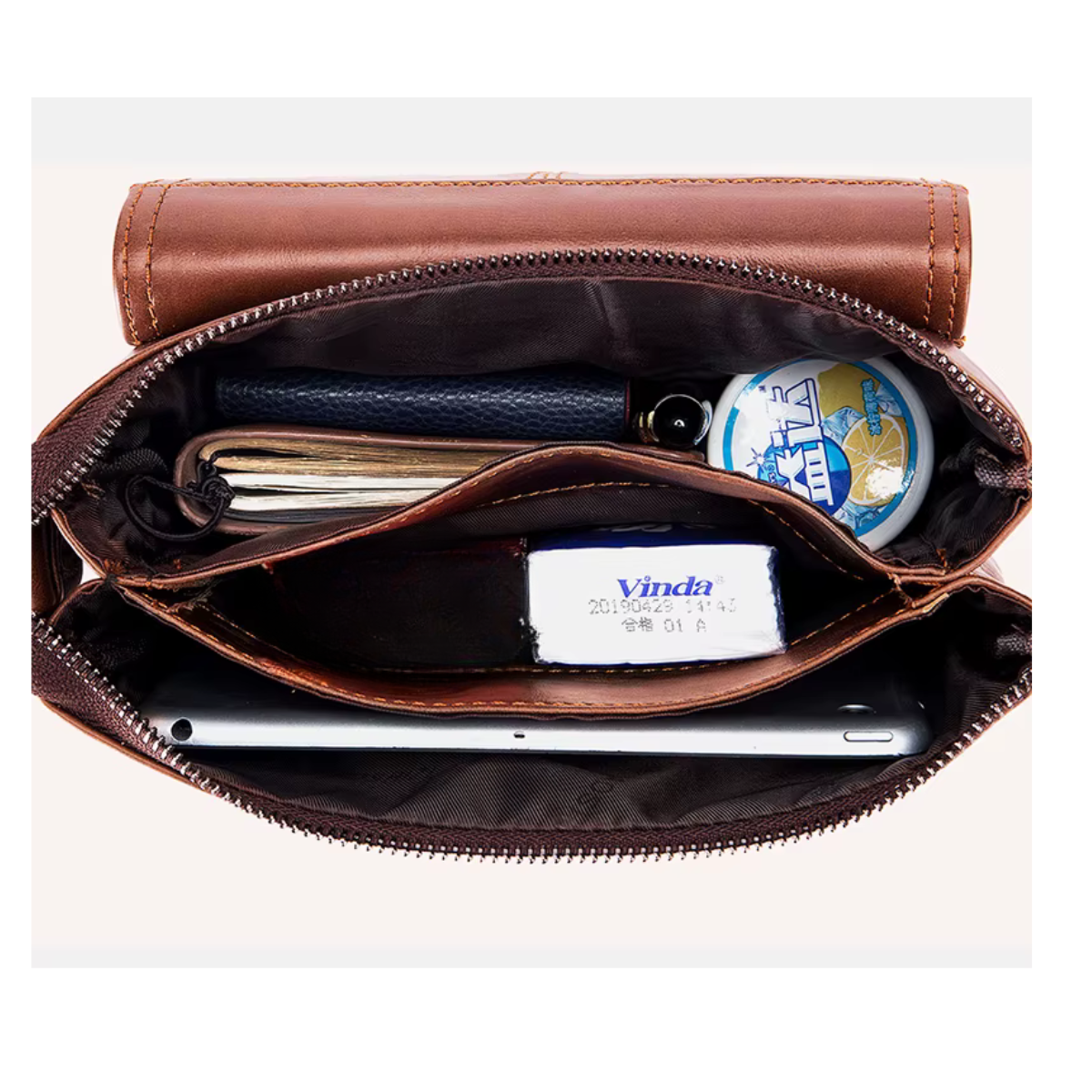 À l’intérieur, chaque détail a été étudié pour offrir une organisation fluide et intuitive : poches dédiées pour téléphone, portefeuille et clés, compartiment principal spacieux et doublure résistante pour protéger vos essentiels.
