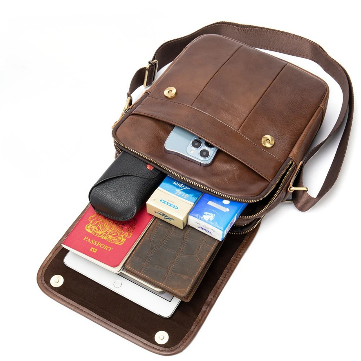 Capacité : téléphone, portefeuille, tablette 8", clés, passeport, cartes